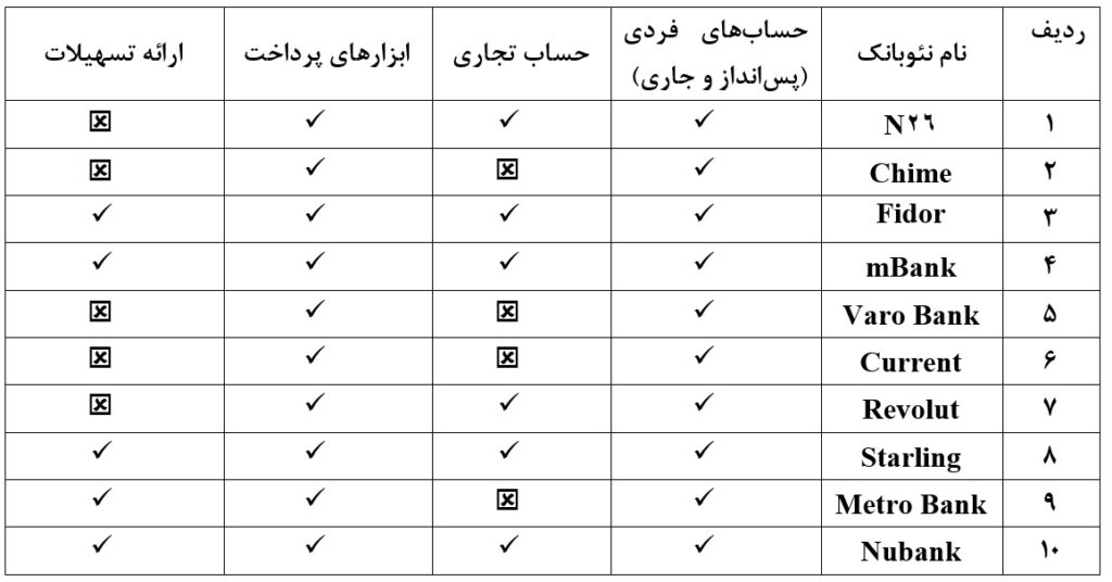 در جدول زیر، تعدادی از نئوبانکها به لحاظ دارا بودن فعالیتها و امکاناتی که در اختیار مشتریان خود قرار میدهند با یکدیگر مقایسه شدهاند: